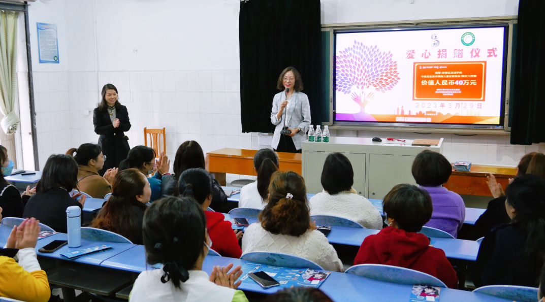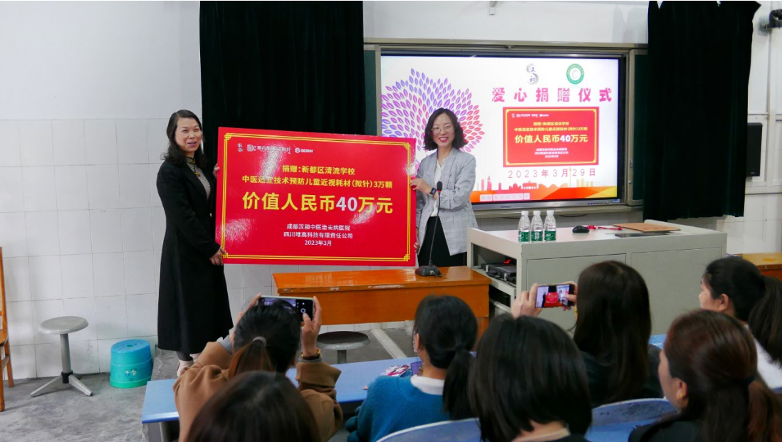 活動最后,舉行了愛心捐贈儀式。唯高集團向學校捐贈了價值40萬元的預防兒童近視中醫技術耗材撳針,共計3萬顆。全方位助力學校開展近視防控工作,充分發揮中醫藥改革試驗基地的優勢,服務于轄區內的兒童眼健康。會上,學校黨支部書記、校長劉元紅接收了唯高集團副總經理朱蕓女士交予的捐贈牌。劉校長代表學校向唯高集團表示感謝,朱蕓女士表示希望通過開展這樣有意義的活動,帶動更多的家長和學生重視近視預防,也期待未來孩子們都有更加明亮的眼睛。