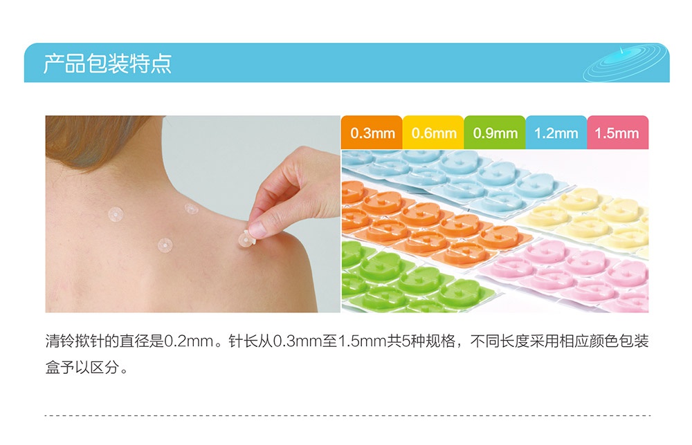 撳針是一種創(chuàng)新型皮內(nèi)針,具有安全,方便,舒適,無(wú)創(chuàng)痛等特點(diǎn)。2002年開(kāi)始研發(fā),2004年正式在日本上市。撳針直徑均為0.2mm。針長(zhǎng)從0.3mm至1.5mm共五種規(guī)格。按照日本QMS(醫(yī)療器械生產(chǎn)質(zhì)量管理體系)生產(chǎn)。獲得美國(guó)FDA認(rèn)證,歐洲CE認(rèn)證,SFDA認(rèn)證及ISO13485質(zhì)量體系認(rèn)證。
